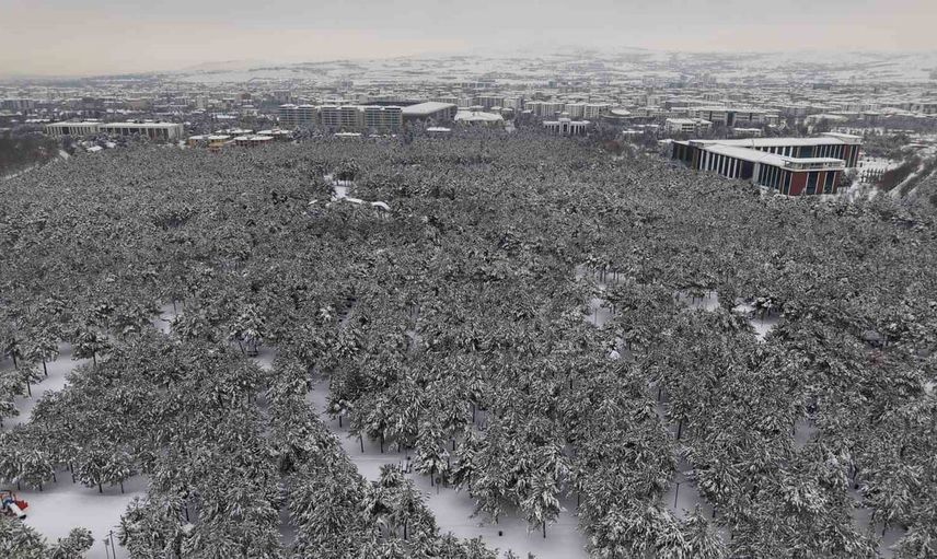 ELAZIĞ’DA KAR YAĞIŞI SONRASI ŞEHRİN KALBİNDEKİ FIRAT ÜNİVERSİTESİ ORMANI VE KÜLTÜR PARK, BİNALARIN ARASINDA YÜKSELEN BEYAZ BİR VAHAYA DÖNÜŞTÜ