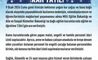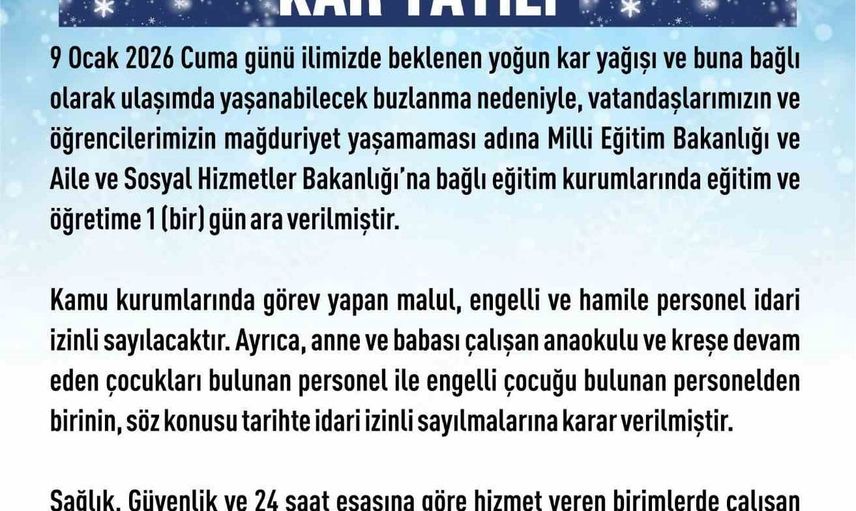 Elazığ Valiliği tarafından yapılan açıklamada, "9 Ocak 2026 Cuma günü ilimizde beklenen yoğun kar yağışı ve buna bağlı olarak ulaşımda yaşanabilecek buzlanma nedeniyle, vatandaşlarımızın ve öğrencilerimizin mağduriyet yaşamaması adına Milli Eğitim Bakanlığı ve Aile ve Sosyal Hizmetler Bakanlığı’na bağlı eğitim kurumlarında eğitim ve öğretime 1 gün ara verilmiştir. Kamu kurumlarında görev yapan malul, engelli ve hamile personel idari izinli sayılacaktır." denildi.