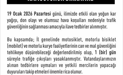 "İlimiz genelinde motosiklet, mobilet ve motorlu kurye faaliyetlerinin can ve mal güvenliğini tehlikeye düşürebileceği değerlendirilmiştir. Bu sebeple, 1 (bir) gün süreyle bu araçların trafiğe çıkışları yasaklanmıştır. Vatandaşlarımızın alınan tedbirlere uymaları ve yetkili mercilerin duyurularını takip etmeleri önemle rica olunur."