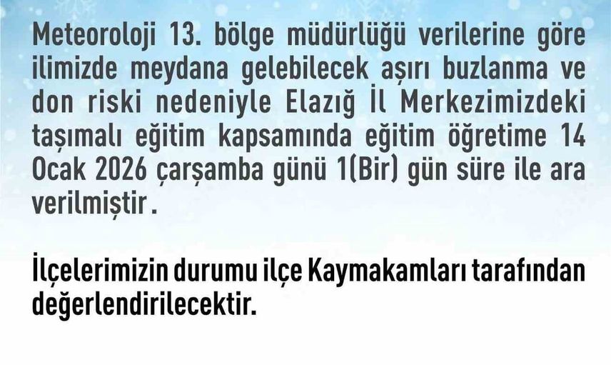 Elazığ Valiliği’nden yapılan açıklamada, "Meteoroloji 13. Bölge Müdürlüğü verilerine göre ilimizde meydana gelebilecek aşırı buzlanma ve don riski nedeniyle Elazığ il merkezimizdeki taşımalı eğitim kapsamında eğitim-öğretime 14 Ocak 2026 Çarşamba günü bir gün süre ile ara verilmiştir" denildi.