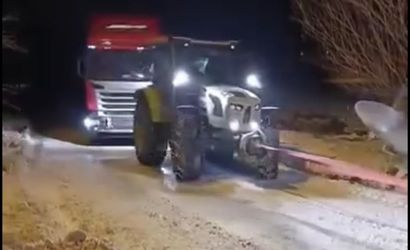 Merkeze bağlı Uzuntarla köy yolunda meydana gelen olayda, bir tır kar ve buz nedeniyle yolda kaldı. Durumu fark eden köylüler ve İl Özel İdaresi ekipleri hemen harekete geçti. İlk olarak, bir kar küreme aracı, halat ile tıra bağlandı. Ardından, bu halat iki traktöre de bağlanarak, araçlar iş birliği içinde hareket etti.