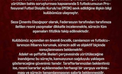 Kulüp yönetimi tarafından yapılan açıklamada, "Türkiye Futbol Federasyonu tarafından yürütülen bahis soruşturması kapsamında, futbolcularımızın disiplin kuruluna sevk edildiğine ilişkin bilgi tarafımıza ulaşmıştır. Seza Çimento Elazığspor olarak, resmi yazışmalar dikkatlice incelenmekte ve süreç titizlikle takip edilmektedir. En büyük önceliğimiz, camiamızın ve futbolcularımızın itibarını korumaktır," denildi.
