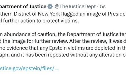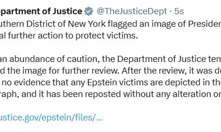 ABD Adalet Bakanlığı, Trump’ın görüldüğü bir görselin incelemesinin ardından yeniden yayınlandığını belirtti. Aylık inceleme sürecinin sonunda, ilgili fotoğrafta Epstein kurbanlarının bulunduğuna dair hiçbir bulguya rastlanmadığını açıkladı.
