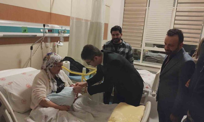 Kaymakam Murat Karaloğlu, hastane personelinin yeni yılını kutlarken, gün içinde doğan bebeklerin ailelerine hediyeler takdim etti. Mert Buğra, kendisine verilen çeyrek ile birlikte özel bir kutlama ile karşılandı. Karaloğlu, "Hayırlı olsun. Rabbim devletine milletine hayırlı evlatlar eylesin" dedi.