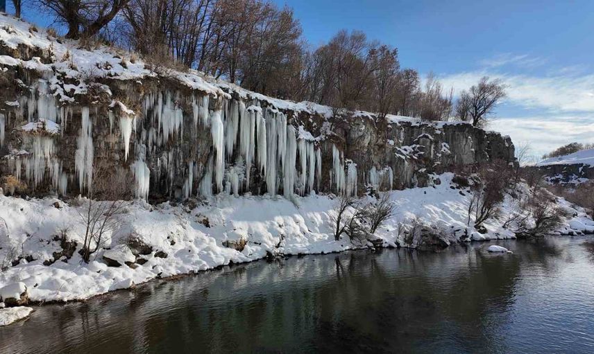 Van’ın Erciş ilçesinde yer alan Koçköprü Kanyonu, metrelerce yüksekliğe ulaşan buz sarkıtları ile göz kamaştırıyor.