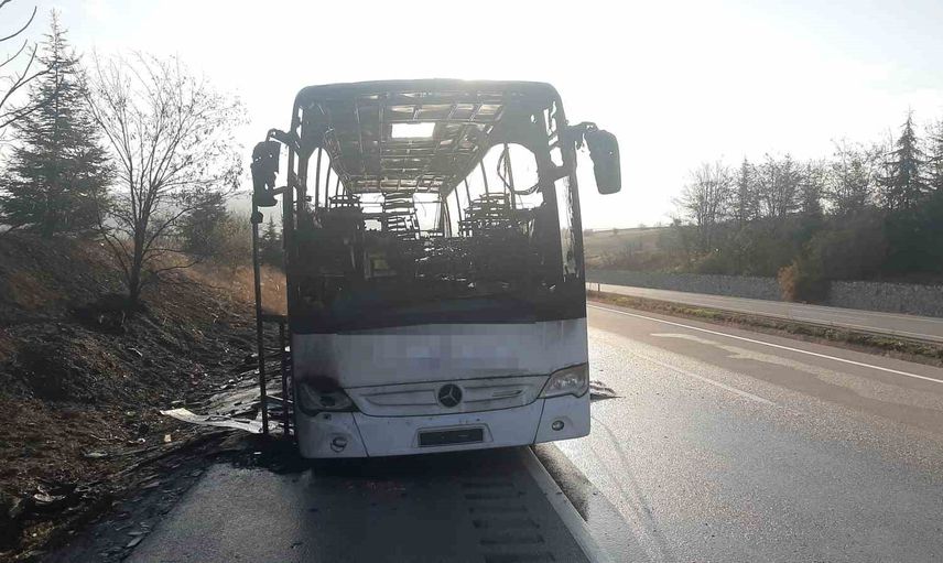 Karabük’ün Eskipazar ilçesinde, seyir halindeyken motor kısmında yangın çıkan bir yolcu otobüsü, alevlerle kaplanarak tamamen yanarak kullanılamaz hale geldi.