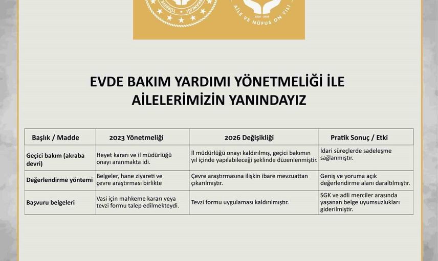 AİLE VE SOSYAL HİZMETLER BAKANLIĞI VE MALİYE BAKANLIĞINCA ‘EVDE BAKIM YARDIMI YÖNETMELİĞİ'NDE YAPILAN DEĞİŞİKLİKLE, HANE GELİRİNİN HESAPLANMASINA İLİŞKİN USUL VE ESASLARDA DÜZENLEMELERE GİDİLDİ.