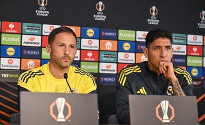 UEFA Avrupa Ligi'nin üçüncü haftasında Alman ekibi Stuttgart'ı konuk edecek Fenerbahçe'de teknik direktör Domenico Tedesco (solda) ve Sarı-lacivertli oyuncu Edson Alvarez (sağda) Fenerbahçe Can Bartu Tesisleri'nde düzenlenen basın toplantısında konuşma yaptı.