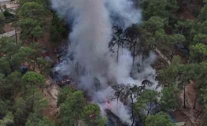 Fethiye'nin Yanıklar Mahallesi'nde, Katrancı Koyu Tabiat Parkı'nda bir karavanda çıkan yangın, hızla çevredeki ormanlık alana sıçradı. Yangının başladığı karavan, dumanların yükselmesiyle bölge halkının dikkati çekti.