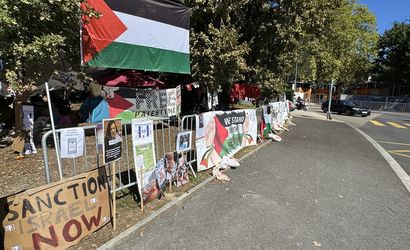 Protestocular, Sivillere yönelik şiddeti sembolize eden kırık sandalye heykelinin yanında çadırlar kurarak, Gazze'deki durumu "soykırım" olarak nitelendirip bunun durdurulmasını talep ediyorlar. Çocuk maketleri ve kanlı giysilerle süslenmiş çadır alanında, öldürülen çocukları anmaya özen gösterilmektedir.