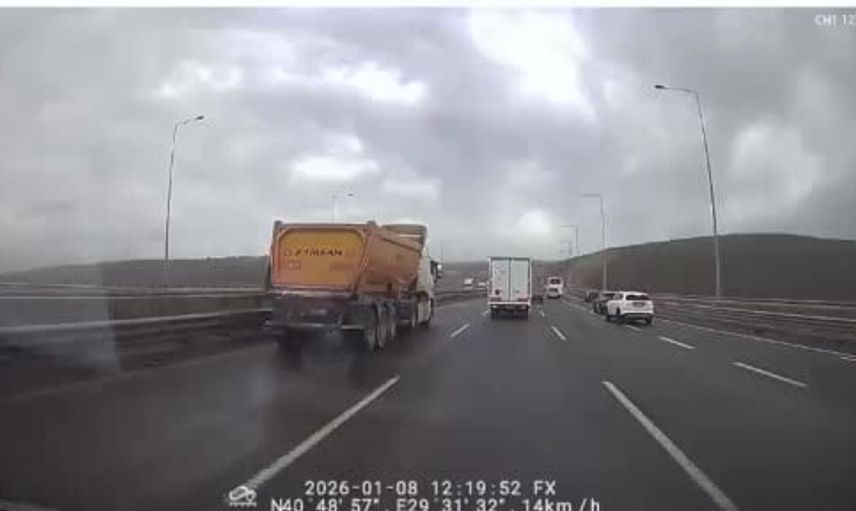 Otoyolun Dilovası ilçesi bölgesinde seyir halindeki bir kamyonet ve iki tır, şiddetli rüzgarın etkisiyle kontrolden çıkarak devrildi. Olay anı güvenlik kameralarına yansıdı.