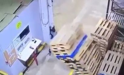 BURSA'DA FORKLİFT TARAFINDAN ÜST ÜSTE DENGESİZ YERLEŞTİRİLEN PALETLER, DEVRİLDİ. O ESNADA PALETLERİN YANINDA OLAN BİR KADIN ÇALIŞAN, REFLEKSİ SAYESİNDE ÖLÜMDEN DÖNDÜ.