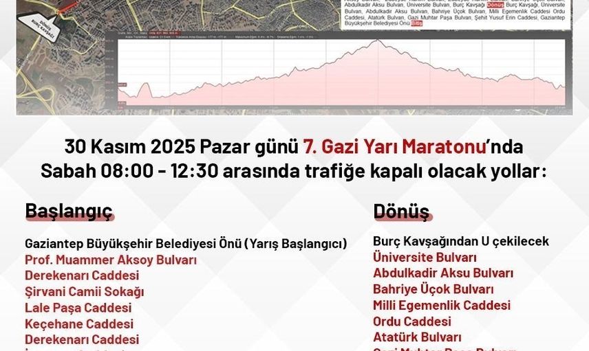 Gaziantep Büyükşehir Belediyesi tarafından düzenlenen 7. Gazi Yarı Maratonu, 30 Kasım 2025 Pazar günü saat 08.00 ile 12.30 arasında gerçekleşecek. Bu etkinlik nedeniyle, şehir merkezinde bazı yollar trafiğe kapatılacak.