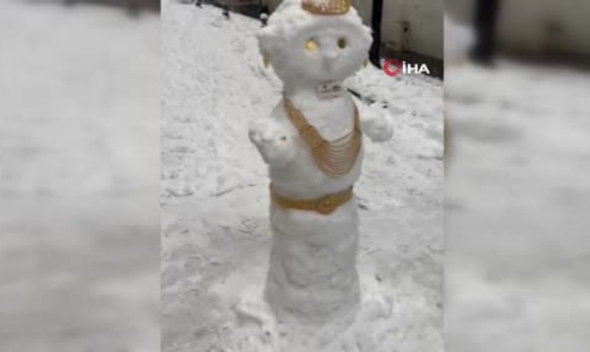 Nizip ilçesinde bir kuyumcu, kar yağışı nedeniyle müşteri bulamayınca, iş yerinin önünde bir kardan gelin yaptı. Bu kardan gelin, altın bilezikler ve kolyelerle süslenerek vatandaşların ilgisini çekti.