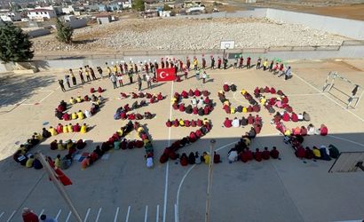 Gaziantep'in Nurdağı ilçesinde ortaokul öğrencileri, Filistin'e destek olmak için okul bahçesinde "Özgür Gazze" yazılı koreografi oluşturdu.