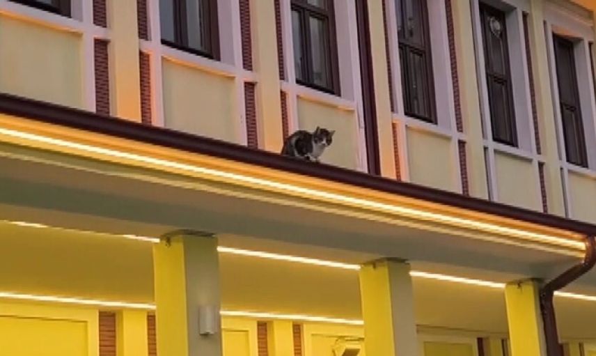 Kedinin bulunduğu çatının aslında inebileceği bir yükseklikte olduğunu göz ardı eden gençler, birbirlerinin omuzlarına çıkarak kediyi almak için seferber oldular. Düşme riskine karşı çantalarını aşağıya açarak tedbir alan gençler, kediyi kurtarmak için yoğun çaba harcadılar.