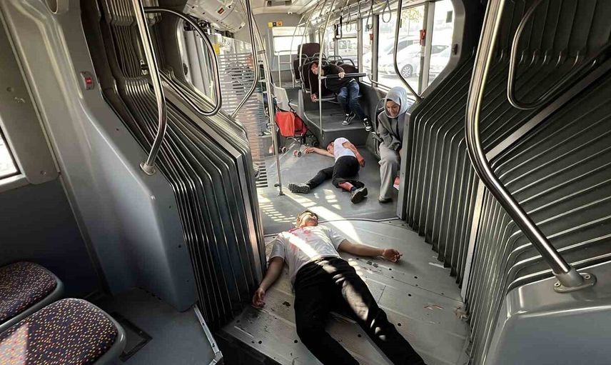 Tatbikatın son kısmında, yolcu otobüsü ile otomobilin çarpışması sonucu yaralılara ilk müdahale senaryosu uygulandı. Gençler, kazazedelerin rollerini üstlenerek bu senaryonun hayata geçirilmesine katkıda bulundular. Trafik kazası ihbarı üzerine sağlık ekiplerinin olay yerindeki ilk müdahale süreci canlandırıldı.