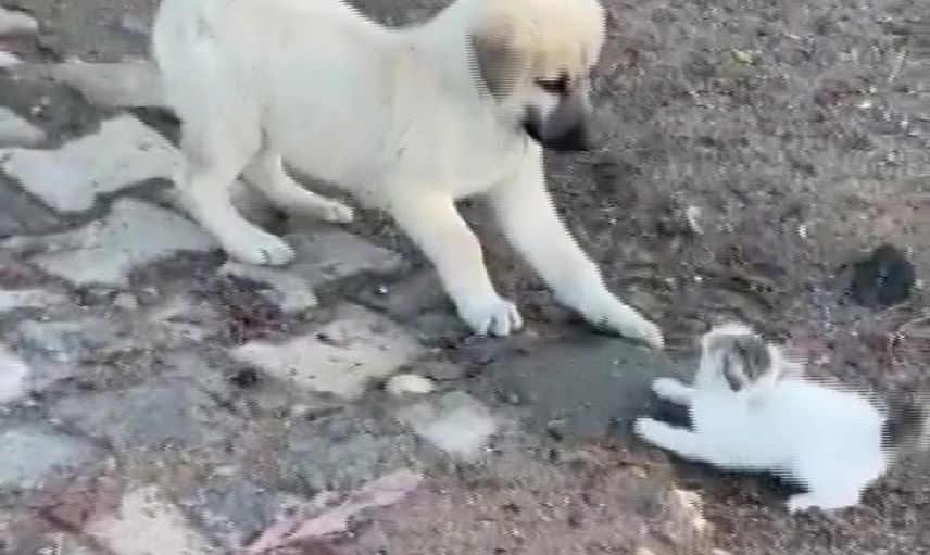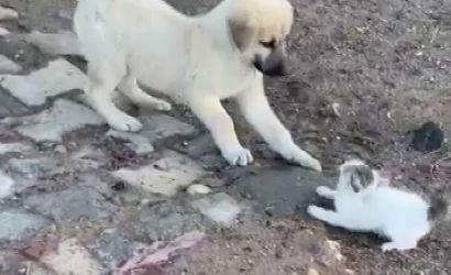 Batman'ın Gercüş ilçesinde, yavru kedi ve yavru köpek arasında geçen sevimli kavga, geçen günlerde cep telefonuyla kaydedildi.