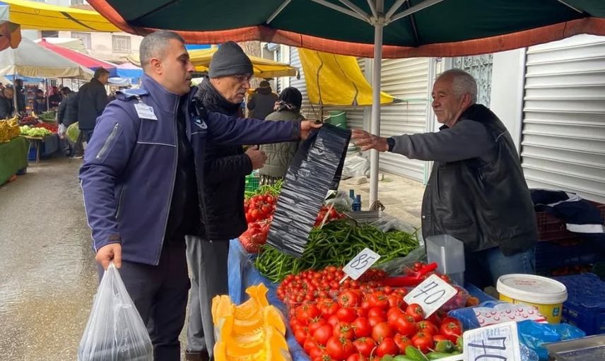 Pazar alanında görüntü kirliliği ve atık sorunlarını engellemek için pazarcı esnafına çöp poşetleri dağıtıldı. Ayrıca, ekipler atıkların düzenli şekilde toplanması için esnafa uyarılarda bulundu.