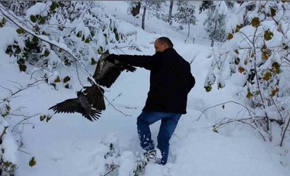 Giresun'un Dereli ilçesine bağlı Yavuzkemal beldesinde, vatandaşlar, yol kenarında karlar içerisinde çığlık atan bir karganın, avlanan bir atmaca tarafından yakalandığını fark etti.