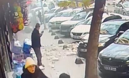 İSTANBUL GÜNGÖREN’DE 5 KATLI BİNANIN EN ÜST KATINDAKİ BALKON ÇÖKTÜ. YAYALAR, DÜŞEN PARÇANIN ALTINDA KALMAKTAN SON ANDA KURTULURKEN, O ANLAR GÜVENLİK KAMERASINA ANBEAN YANSIDI.