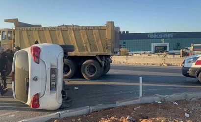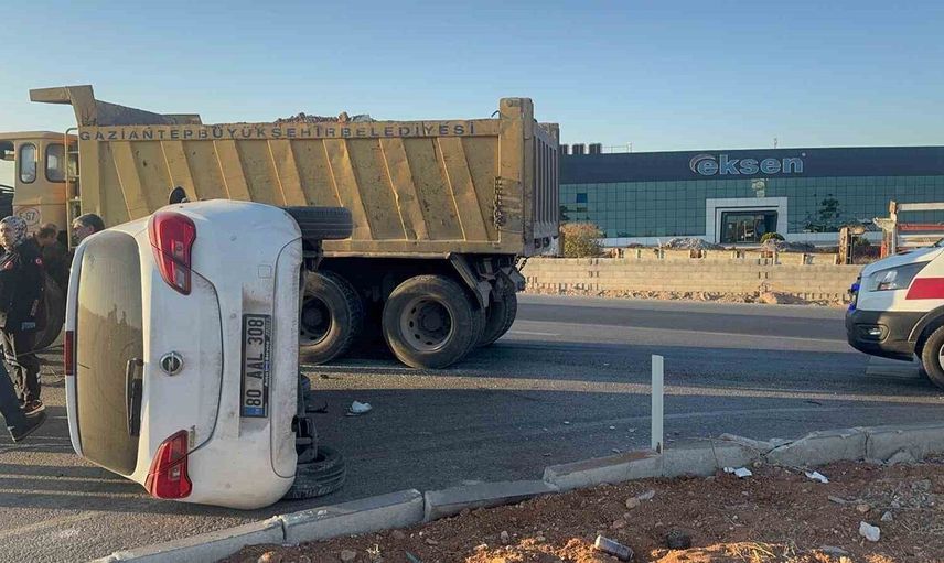 Gaziantep'in Nizip ilçesinde meydana gelen bir trafik kazasında, hafriyat kamyonu ile çarpışan otomobil yan yattı. Olayda 1 kişi yaralandı.