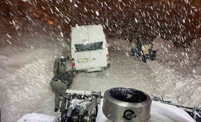 Hakkari'de, Merzan Mahallesi'nde etkili olan yoğun kar yağışı ve tipi, bir yolcu minibüsünün yolda mahsur kalmasına neden oldu.