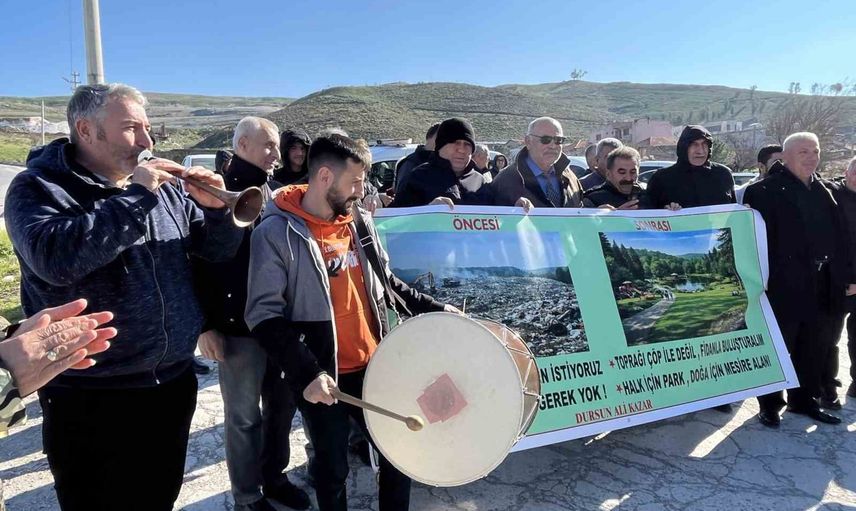 HARMANDALI KATI ATIK DEPOLAMA TESİSİ ÖNÜNDE TOPLANAN BÖLGE HALKI, ALANIN TAMAMEN KAPATILARAK AĞAÇLANDIRILMASINI İSTEDİ.