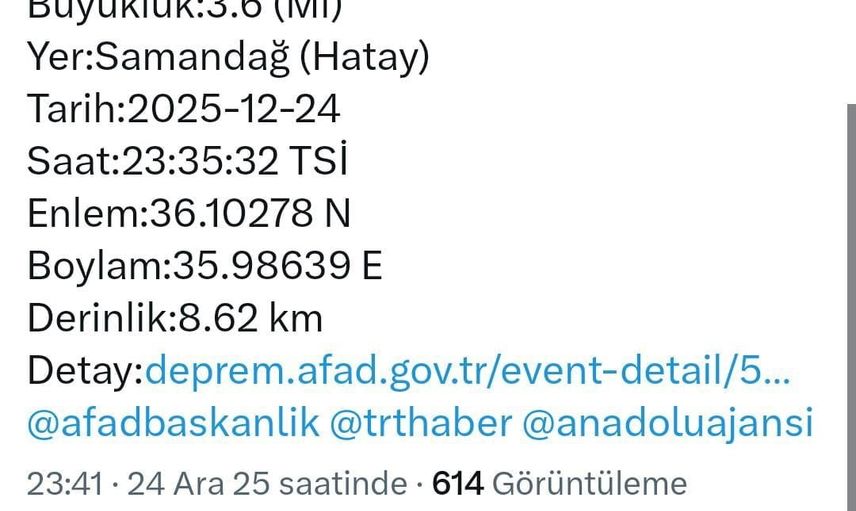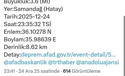 Hatay’ın Samandağ ilçesinde, 3,6 büyüklüğünde bir deprem meydana geldi. AFAD verilerine göre, deprem saat 23:35'te gerçekleşti.
