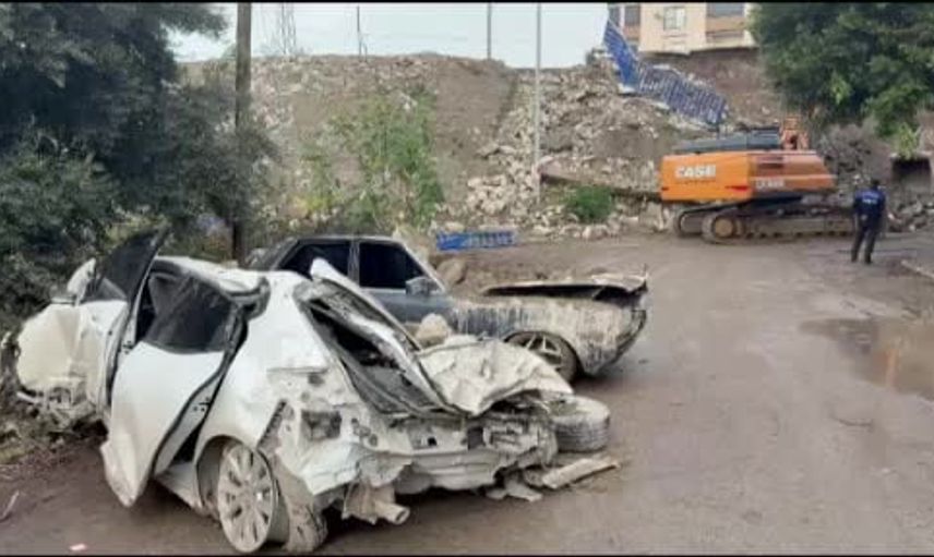 İstinat duvarının altında kalan araçlar demir yığını haline geldi