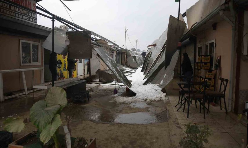 HATAY’DA ETKİLİ OLAN ŞİDDETLİ YAĞIŞLA BİRLİKTE BİRİKEN KAR KÜTLESİNİ TAŞIYAMAYAN PREFABRİK ÇARŞISININ PLASTİK ÇATISI YIKILDI. ÇATININ YERLE BİR OLDUĞU ANLAR KAMERAYA YANSIRKEN OLAYDA YARALANAN OLMADI.