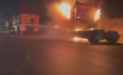 Hatay’ın Antakya ilçesine bağlı Kuruyer Mahallesi'nde, akşam saatlerinde seyir halindeki bir tır aniden yanmaya başladı. Tır, Altınözü-Antakya yolunda bilinmeyen bir sebeple alev aldı.