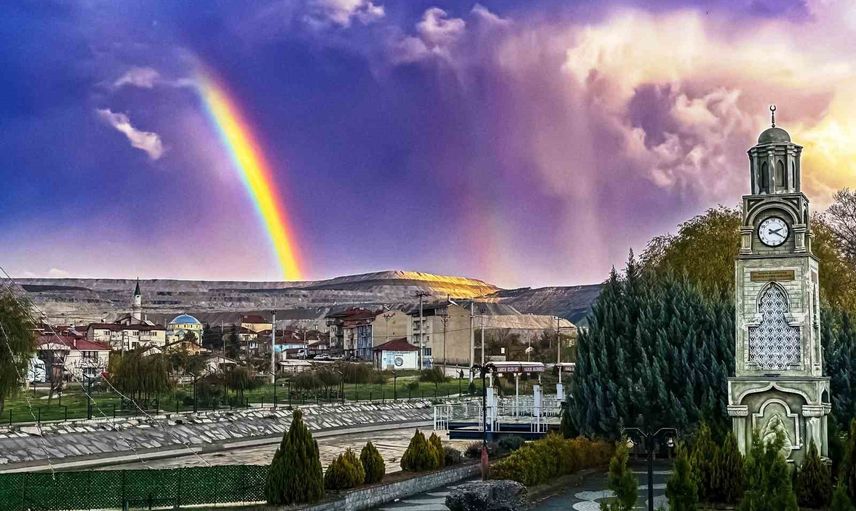 Kütahya’nın Hisarcık ilçesinde, yağmurun ardından beliren gökkuşağı, Gençlik Parkı’ndaki Saat Kulesi’nin üzerinde görsel bir şölen oluşturdu. Yağmur sonrası ortaya çıkan bu renkli manzara, bölge halkının büyük ilgisini topladı.