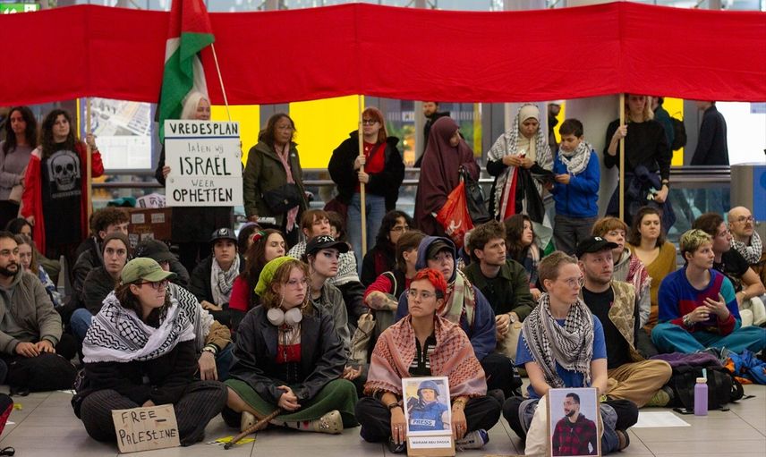 Hollanda'da Utrecht, Amsterdam ve Rotterdam başta olmak üzere farklı kentlerdeki toplam 20 tren istasyonunda, Filistin'e destek için oturma eylemi düzenlendi. Merkez niteliğindeki Utrecht’te tren istasyonunda toplanan göstericiler, Filistin bayrakları taşıyarak İsrail’in soykırımı durdurması için eylem yaptı.