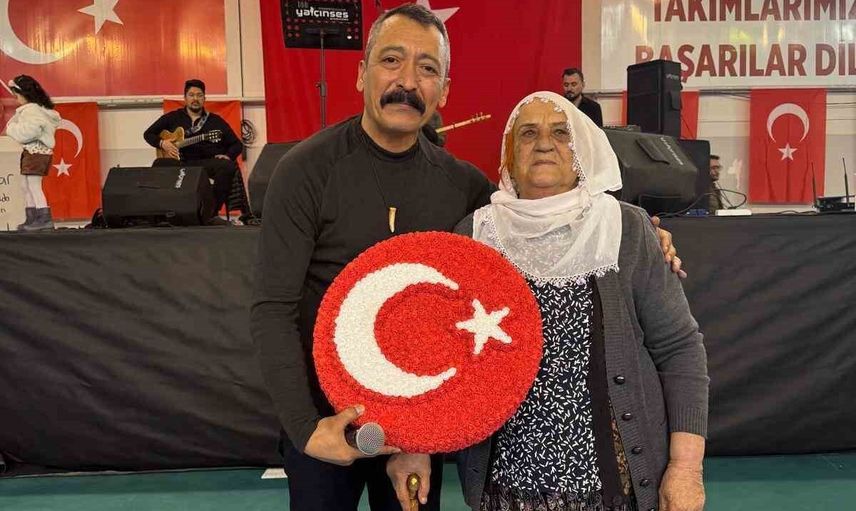 Program sırasında, Hozatlı kadınların el emeğiyle hazırladığı Türk bayrağı, şehit yakını Melek Kızılavuz tarafından sanatçı Alperen Kekilli’ye takdim edildi.