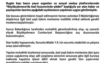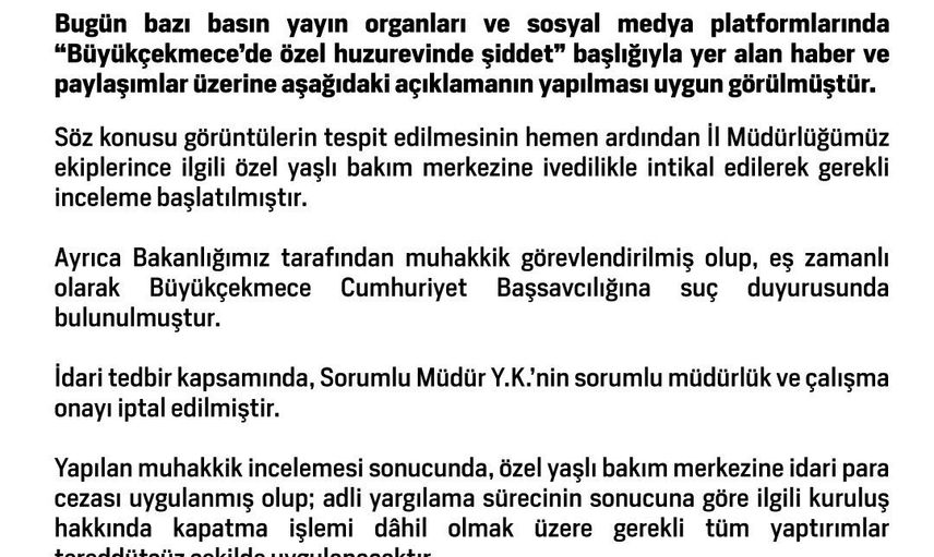 Açıklamada ayrıca, "Söz konusu görüntülerin tespit edilmesinin hemen ardından İl Müdürlüğümüz ekipleri, ilgili özel yaşlı bakım merkezine intikal ederek gerekli incelemeleri başlatmıştır. Aynı zamanda, Bakanlığımız tarafından muhakkik görevlendirilmiş ve Büyükçekmece Cumhuriyet Başsavcılığına suç duyurusunda bulunulmuştur" ifadelerine yer verildi.