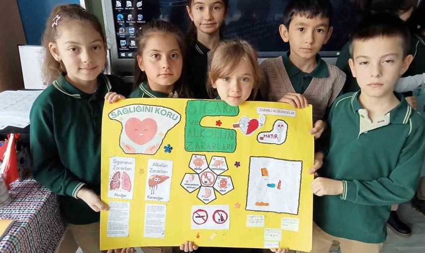 Düzce Karaçalı Süperlik İlkokulu öğrencileri, "Sigara ve Alkolün Zararları" temalı bir afiş hazırlayarak sağlıklı yaşam bilincini artırmayı hedefledi.