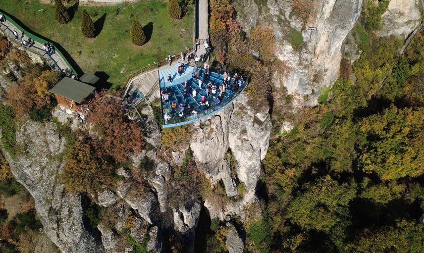 Karabük'ün UNESCO Dünya Mirası Listesi'nde bulunan Safranbolu ilçesindeki İncekaya Kanyonu üzerine yapılan cam seyir terasına gelen ziyaretçiler, sonbaharın tonlarını seyretme imkanı buluyor.