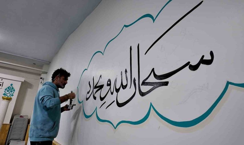 IRAK'IN ERBİL KENTİNDE HAT SANATÇILIĞI YAPAN 40 YAŞINDAKİ MUHAMMED NECAT, VAN'IN ERCİŞ İLÇESİNDEKİ HIFZI EFENDİ CAMİİ DUVARLARINI HAT SANATI İLE DONATTI.