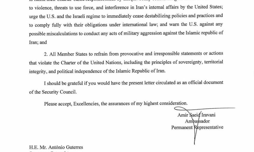 İravani, BM Genel Sekreteri Antonio Guterres ve diğer üyelerden, ABD’nin İran’ın iç işlerine müdahalesine karşı durmalarını istedi. Mektubunda, tüm ülkelerin İran'ın egemenlik ve toprak bütünlüğüne saygı göstermesi gerektiğini vurguladı.