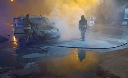 Hatay'ın İskenderun ilçesinde, Dumlupınar Mahallesi'nde seyir halindeyken motor kısmı alev alan bir hafif ticari araçta çıkan yangın, itfaiye ekipleri tarafından söndürüldü.