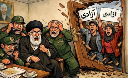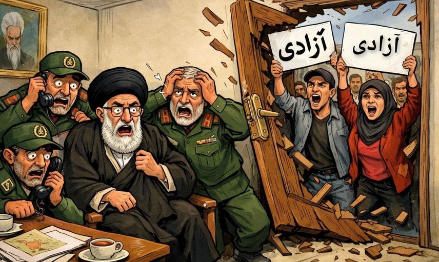 Üçüncü paylaşımda, protestocuların kapıyı kırarak içeri girdiği anın görseliyle İran dini lideri Ayetullah Ali Hameney'in bir odada gizlendiği gösterildi. Burada yer alan ifadeler ise "İsrail için belirledikleri yıkım takvimi şimdi kendileri için belirlenmiş oldu" şeklinde oldu.