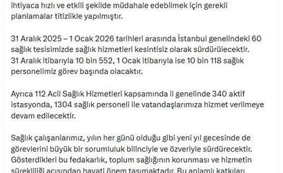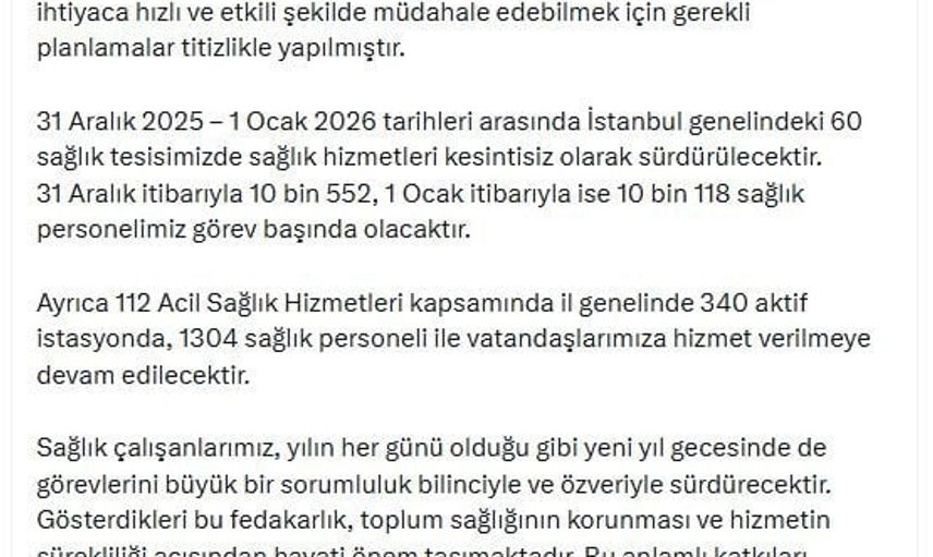 Doç. Dr. Güner, sosyal medya üzerinden yaptığı paylaşımda, "Yılbaşı süresince vatandaşlarımıza sağlık hizmeti sunmak amacıyla tüm hazırlıklarımız tamamlandı. İstanbul genelindeki 60 sağlık tesisimiz 31 Aralık 2025-1 Ocak 2026 tarihleri arasında kesintisiz hizmet verecektir. 31 Aralık itibarıyla 10.552, 1 Ocak itibarıyla ise 10.118 sağlık çalışanımız görevde olacaktır," ifadelerini kullandı.