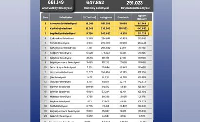 Arnavutköy Belediyesi'ni Kadıköy Belediyesi 647,852 etkileşimle izlerken, Beylikdüzü Belediyesi de 291,023 etkileşimle üçüncü sırada yer aldı.