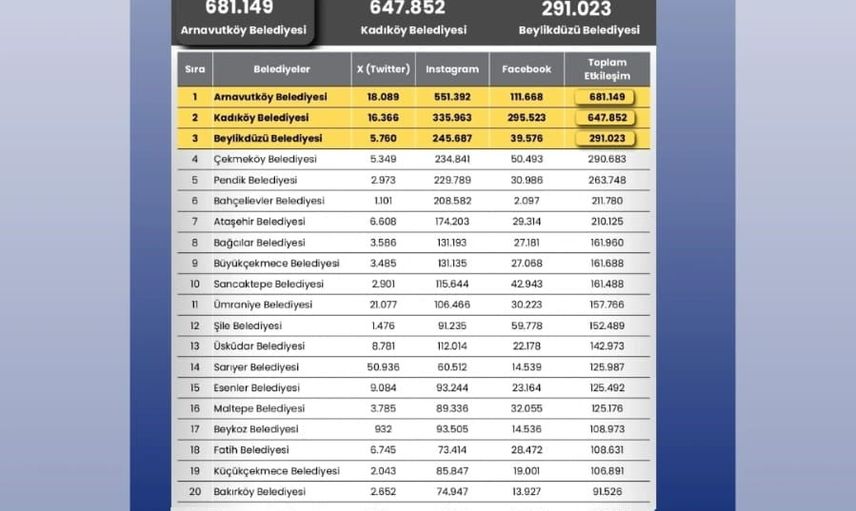 İstanbul ilçe belediyeleri arasında yapılan sosyal medya performans değerlendirmesine göre, Arnavutköy Belediyesi 2025 yılı verileriyle öne çıktı. Sosyal medya etkileşimleri açısından en yüksek başarıyı elde eden belediye, 681,149 etkileşim rakamıyla listenin zirvesine yerleşti.
