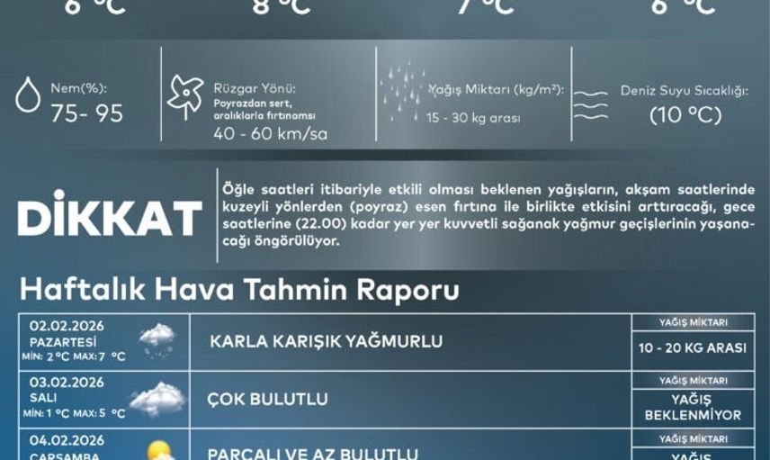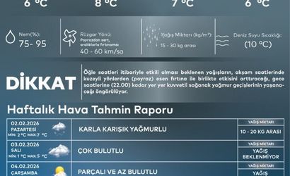 Ayrıca AKOM, 2 Şubat Pazartesi günü için hava tahminlerini paylaştı. Hava sıcaklıklarının en düşük 2 derece, en yüksek ise 7 derece olarak ölçülmesi bekleniyor. Bu günlerde karla karışık yağmurun etkili olacağı belirtildi.