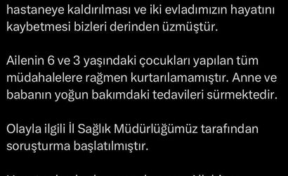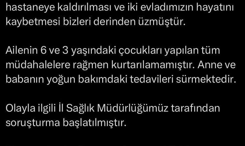 Ailenin anne ve babasının ise yoğun bakımda tedavileri devam etmektedir. Güner, "Hayatını kaybeden yavrularımıza Allah’tan rahmet, ailelerine sabır diliyorum. Tedavi sürecindeki aile fertlerinin yanında olacağız" şeklinde konuştu.