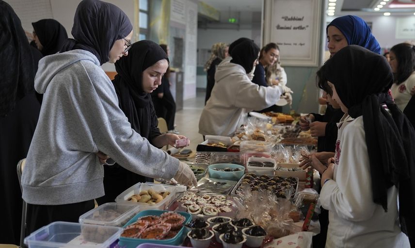 Ümraniye Saray Anadolu İmam Hatip Lisesi'nde düzenlenen kermeste, ortaokul ve lise öğrencileri kek, börek, poğaça, makarna ve gözleme gibi yiyecekleri, ayrıca çeşitli süs eşyalarını stantlarda sergiledi. Öğrenciler ve kermese katılan aileler, alışveriş yaparak etkinliğe destek verdiler.