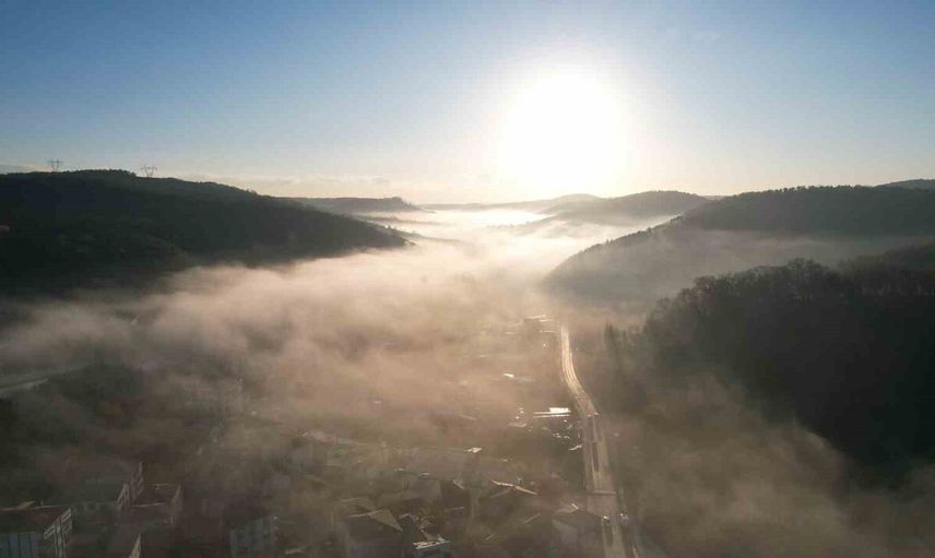 Dron ile alınan havadan görüntüler, Boğazköy'ü adeta bir kartpostal gibi gözler önüne seriyor. Yoğun sis, Karadeniz dağlarını andıran görseller oluştururken, sabahın ilk ışıkları sisin arasından süzülerek manzarayı daha da etkileyici hale getiriyor.