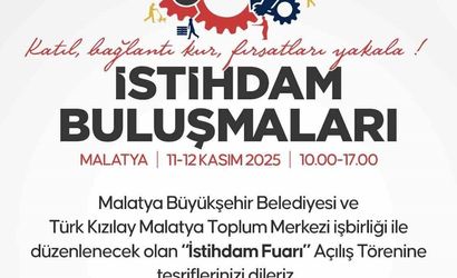 "İstihdam Buluşmaları Malatya" etkinliği, 11 Kasım Salı günü Malatya Sanat Merkezi Fuaye Alanı’nda saat 10.00’da gerçekleştirilecek törenle açılacak. Bu önemli fuar, iki gün süreyle devam edecek.